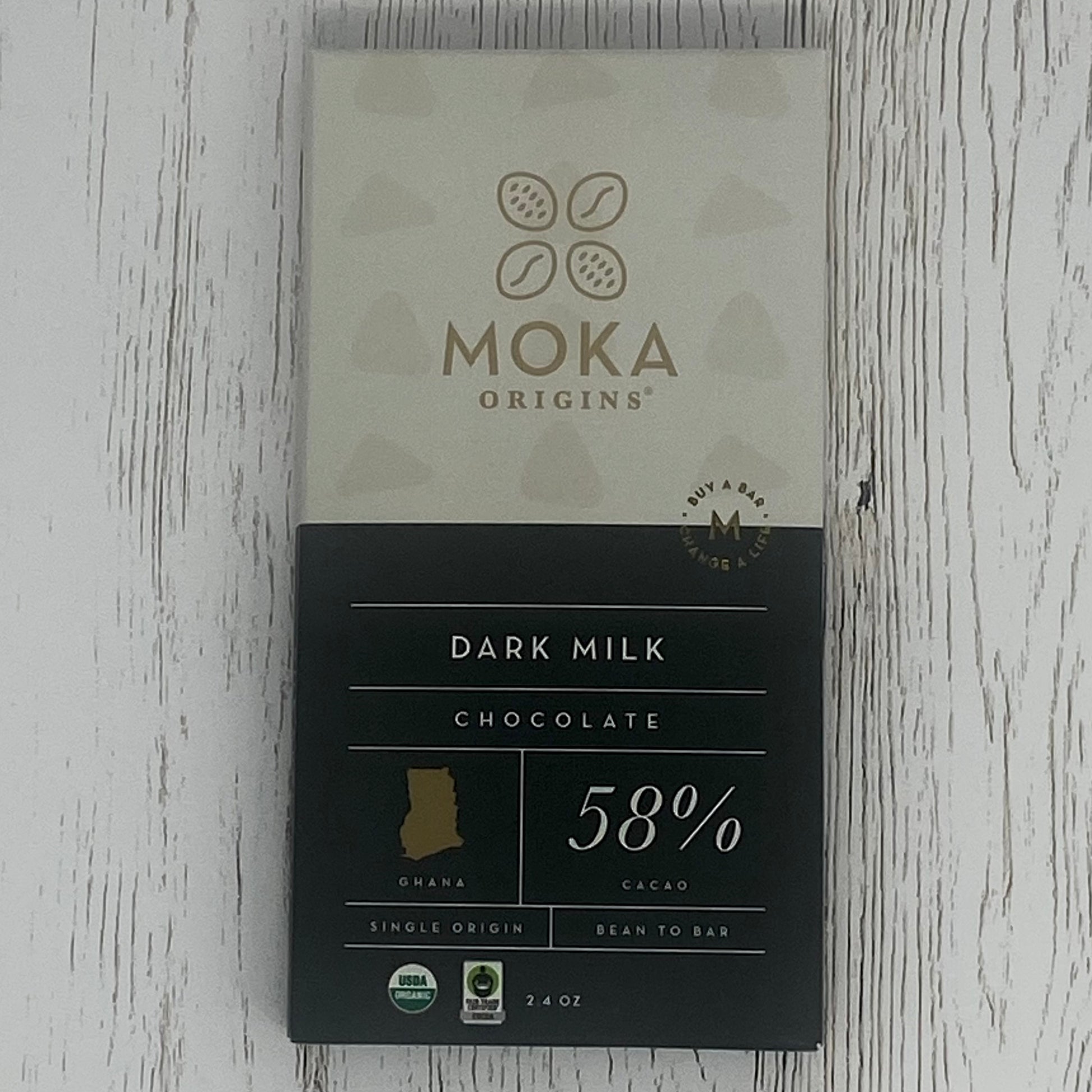 Indulge in the velvety richness of Moka Origins' Dark Milk Chocolate. This exquisite chocolate blend boasts 58% cacao, expertly crafted with organic A2/A2 milk from Alexandre Family Farm.